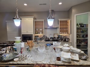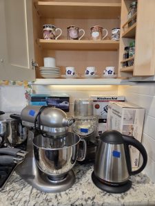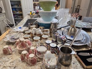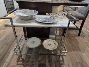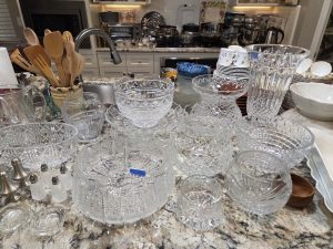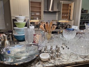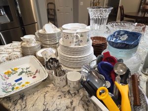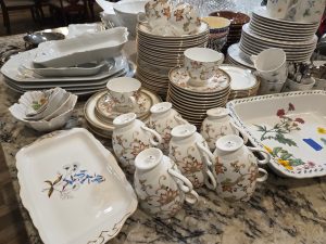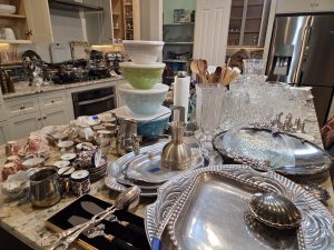 Cooking and serving items from Royal Albert, Wedgewood bone china, Mikasa, KitchenAid 5 q stand mixer and other KitchenAid appliances, Lenox, Arthur Court, multiple Armenian coffee sets and brewing utensils, Nambe, Christofel flatware, Mariposa, L'objet, dozens of utensils from desired brands. And a handsome collection of Asian serveware. Decor items from Limoges France, Lladro, Hummel, many lead crystal serving pieces, Marquis by Waterford, Fenton glass. Pieces from Michael Aram, Large mature plants in stately, sturdy pots.