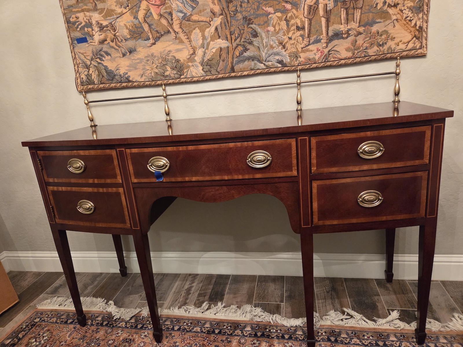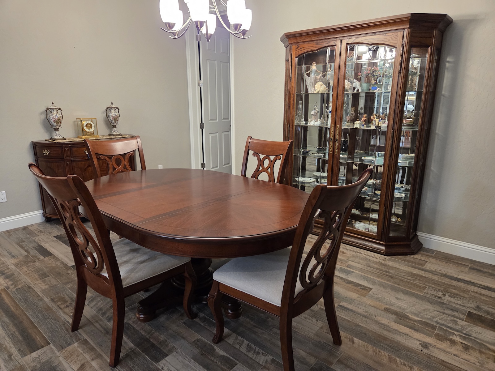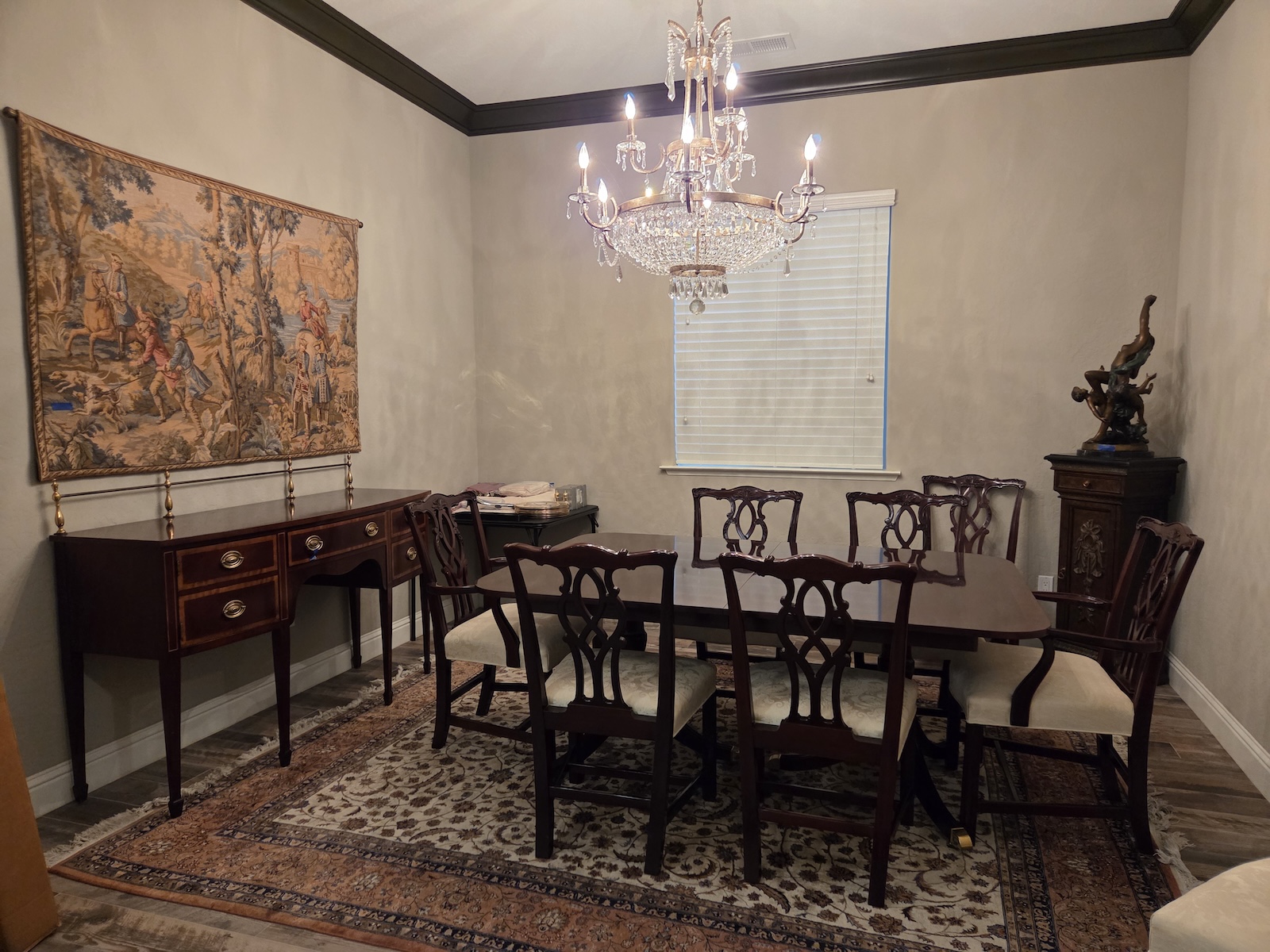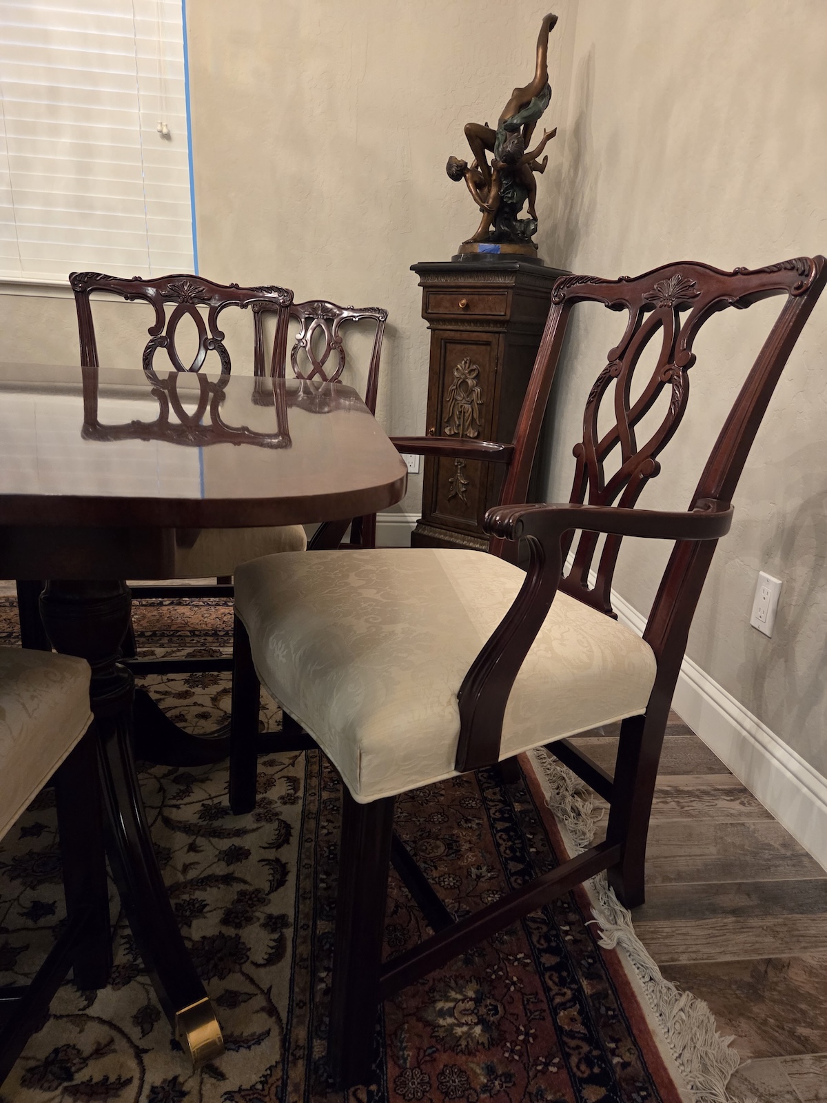 Kindel Dining table 8 Chairs and matching sideboard/buffet, also by Kindel. Another more casual dining table and 4 chairs from Legacy Classics furniture. A *gorgeous* 72" wide mirrored credenza by Hooker Furniture, a sleek glass and acrylic coffee table, and practically new microsuede sofa with carved base and leg detail. 3 new/like new mattresses in Full, Queen, and Cal King. Antique, heirloom arm chairs in well-cared for condition. Elegant, high quality solid wood furniture throughout the estate. Don't miss the green marble topped Louis XV Dutch Checkerboard marquetry bedroom set - photos are beautiful and still don't do justice to the quality of the pieces.