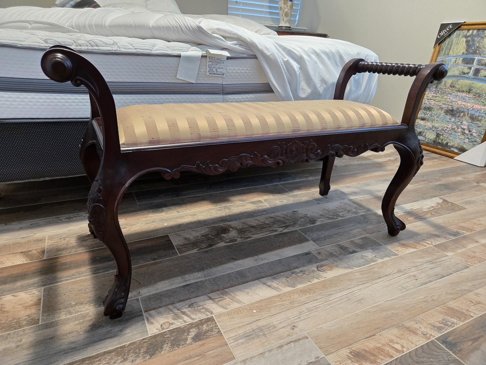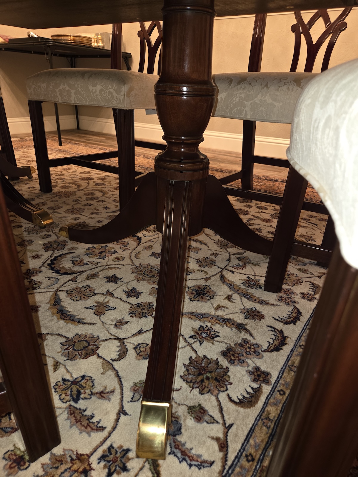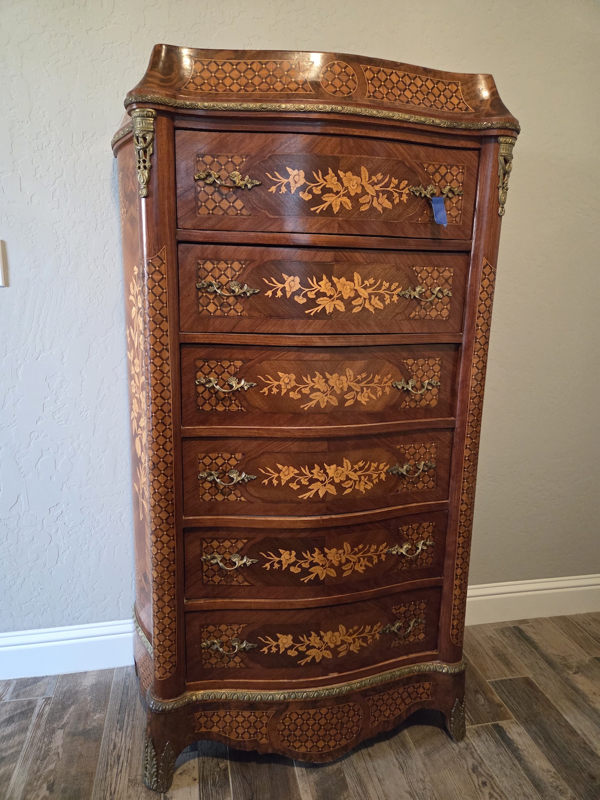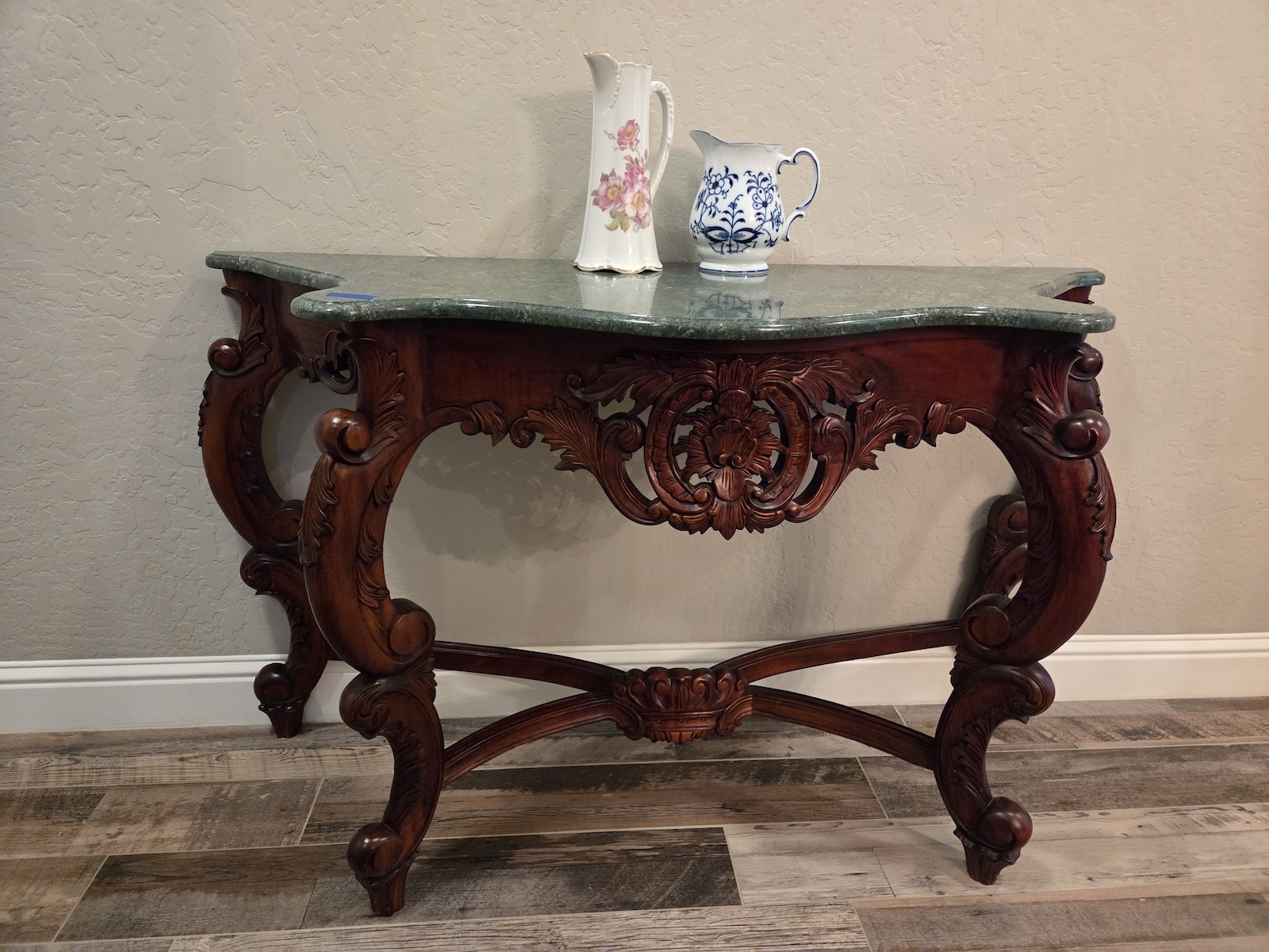 Kindel Dining table 8 Chairs and matching sideboard/buffet, also by Kindel. Another more casual dining table and 4 chairs from Legacy Classics furniture. A *gorgeous* 72" wide mirrored credenza by Hooker Furniture, a sleek glass and acrylic coffee table, and practically new microsuede sofa with carved base and leg detail. 3 new/like new mattresses in Full, Queen, and Cal King. Antique, heirloom arm chairs in well-cared for condition. Elegant, high quality solid wood furniture throughout the estate. Don't miss the green marble topped Louis XV Dutch Checkerboard marquetry bedroom set - photos are beautiful and still don't do justice to the quality of the pieces.