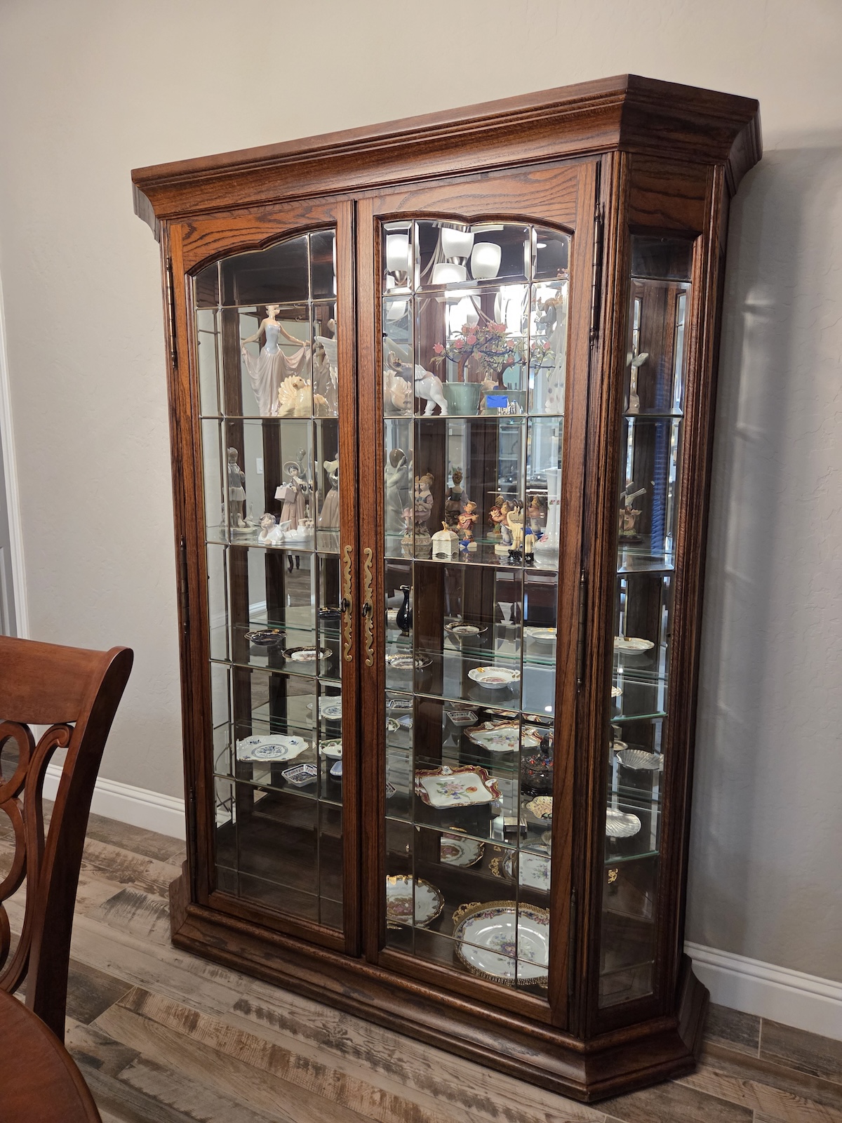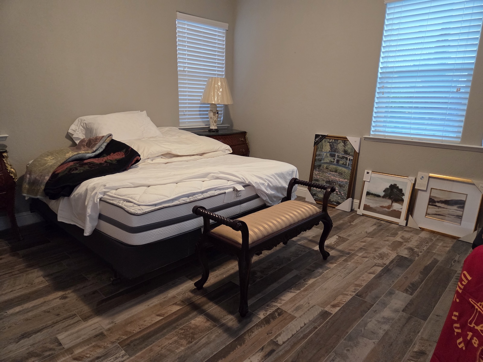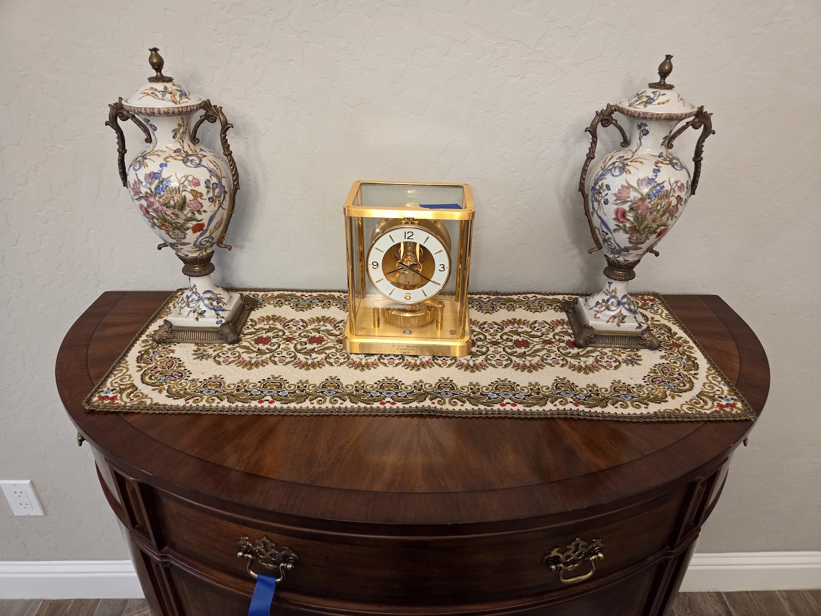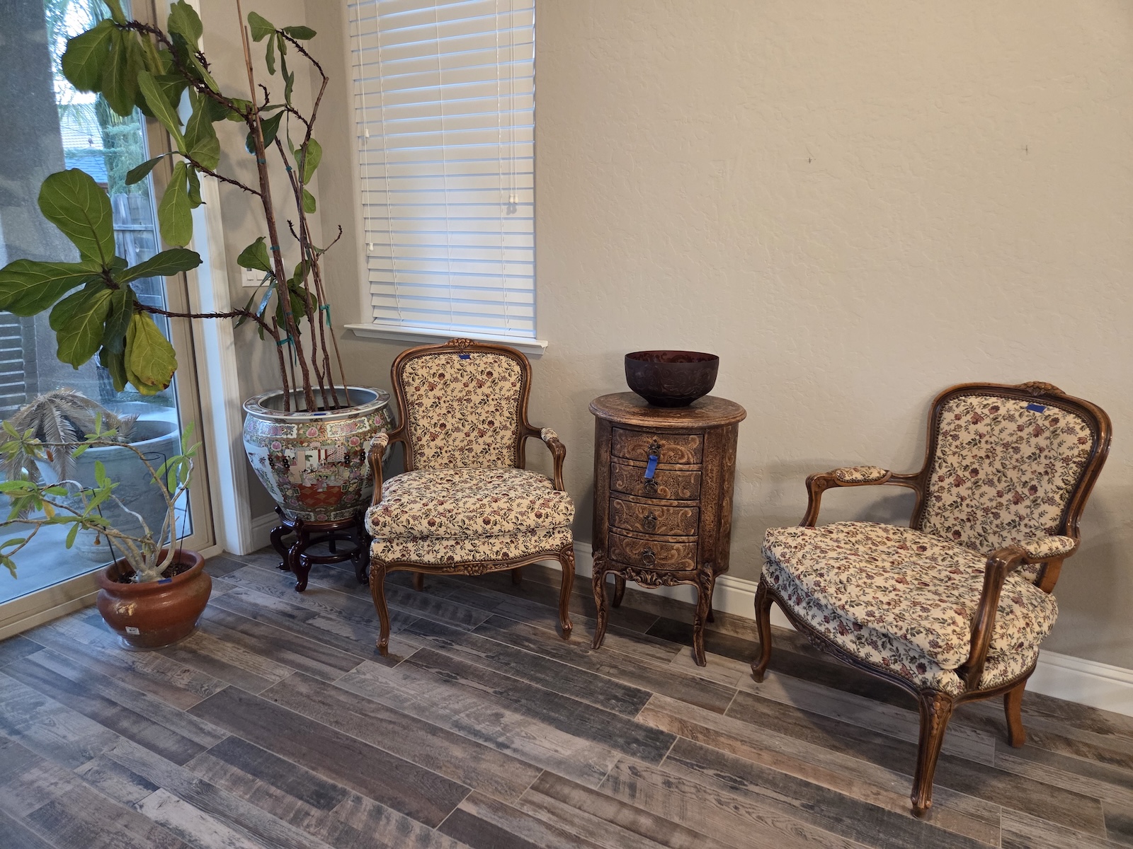 Kindel Dining table 8 Chairs and matching sideboard/buffet, also by Kindel. Another more casual dining table and 4 chairs from Legacy Classics furniture. A *gorgeous* 72" wide mirrored credenza by Hooker Furniture, a sleek glass and acrylic coffee table, and practically new microsuede sofa with carved base and leg detail. 3 new/like new mattresses in Full, Queen, and Cal King. Antique, heirloom arm chairs in well-cared for condition. Elegant, high quality solid wood furniture throughout the estate. Don't miss the green marble topped Louis XV Dutch Checkerboard marquetry bedroom set - photos are beautiful and still don't do justice to the quality of the pieces.