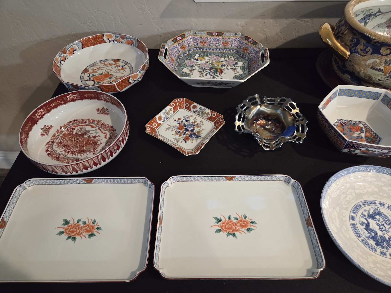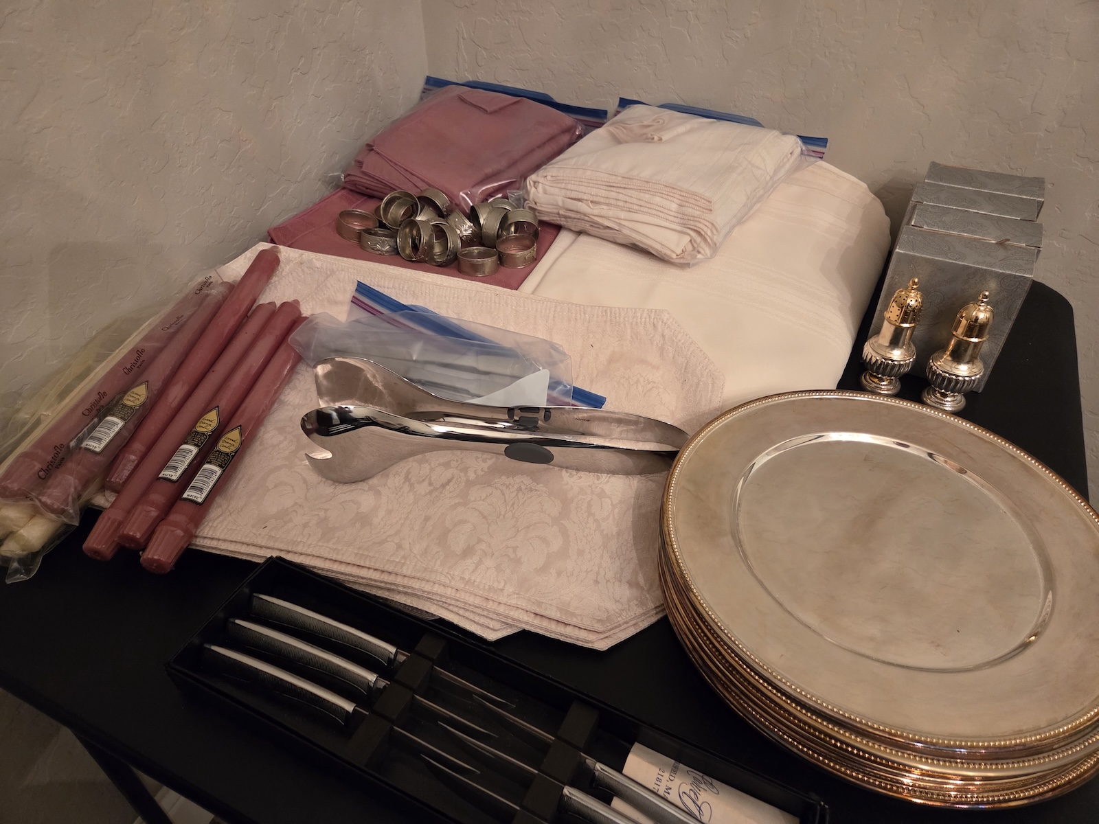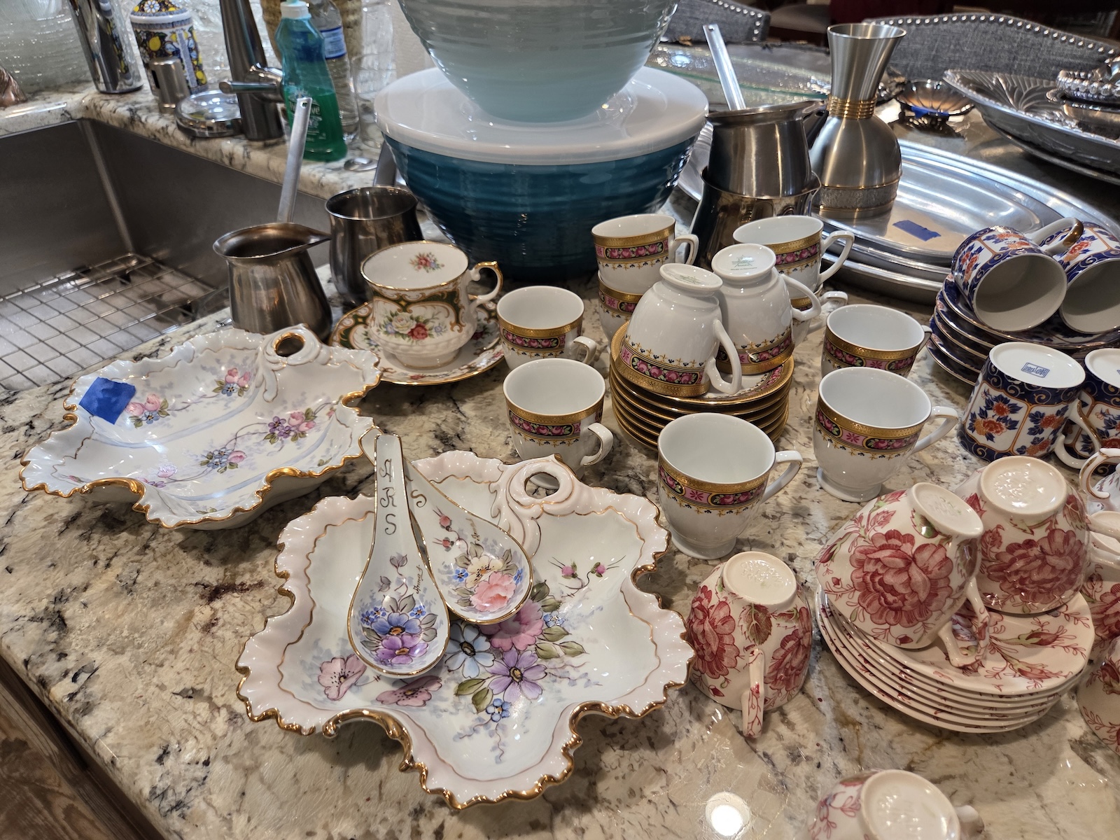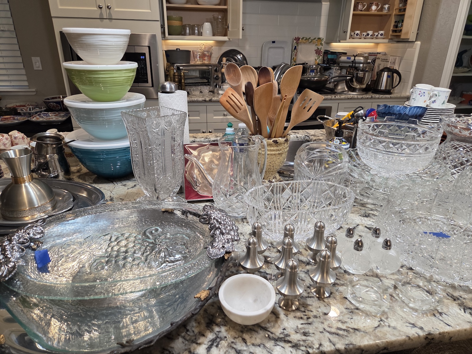 Cooking and serving items from Royal Albert, Wedgewood bone china, Mikasa, KitchenAid 5 q stand mixer and other KitchenAid appliances, Lenox, Arthur Court, multiple Armenian coffee sets and brewing utensils, Nambe, Christofel flatware, Mariposa, L'objet, dozens of utensils from desired brands. And a handsome collection of Asian serveware. Decor items from Limoges France, Lladro, Hummel, many lead crystal serving pieces, Marquis by Waterford, Fenton glass. Pieces from Michael Aram, Large mature plants in stately, sturdy pots.