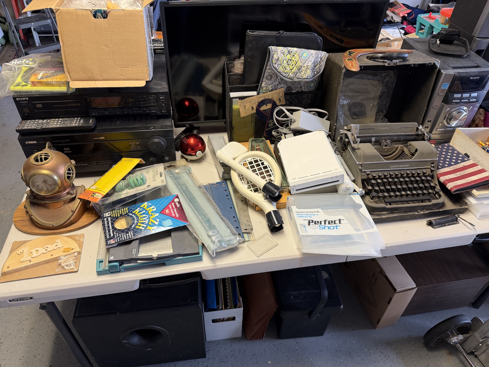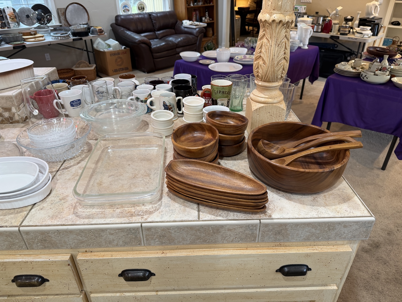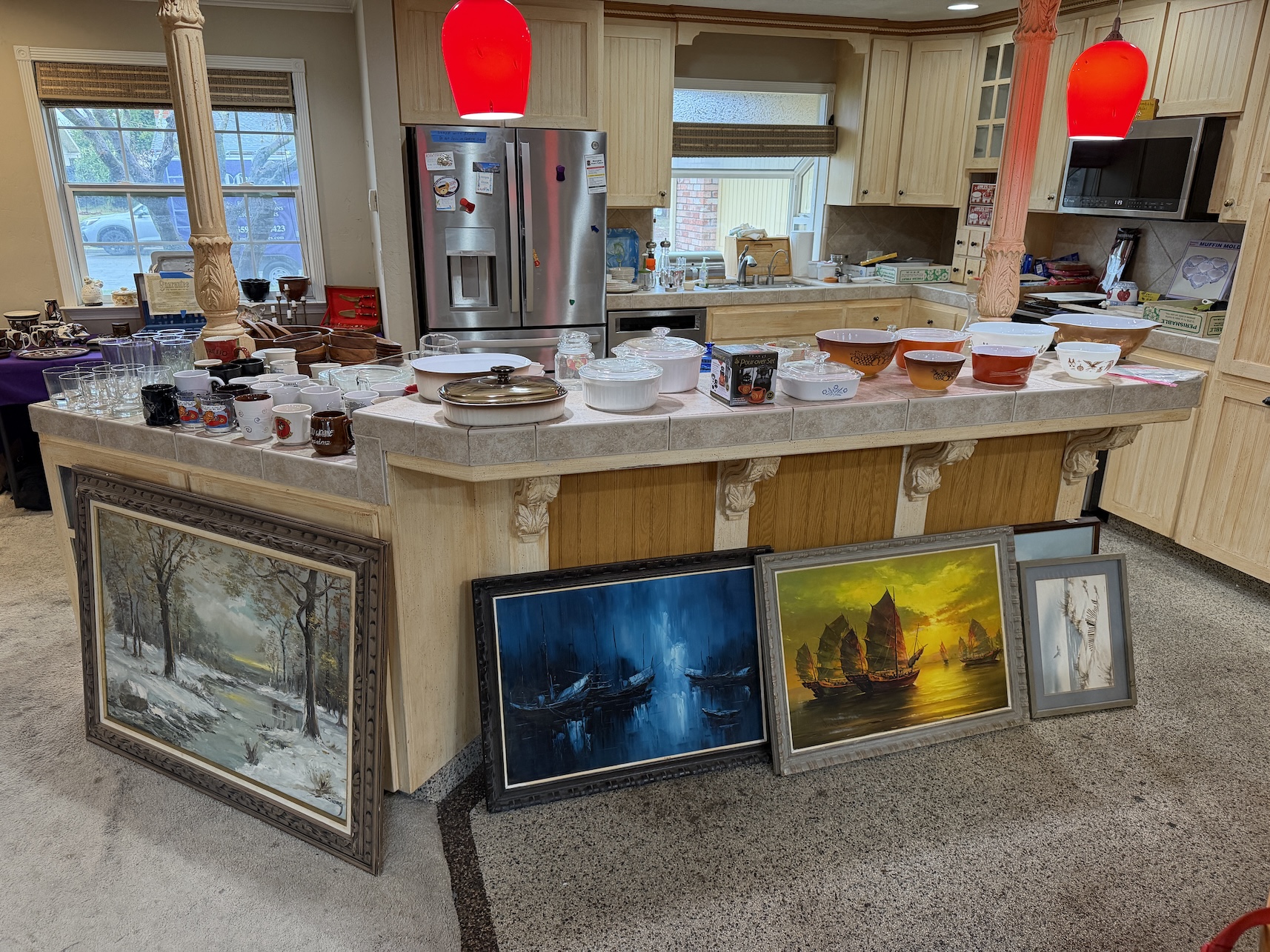 Join us this week for our sale featuring, Nikon cool pics P 100 camera, Shatz nautical clock and barometer, authentic Hawaiian shirts, beautiful teak dining set with teak buffet and display shelf, vintage Pyrex, lots of vintage PlaySkool items, books, tools, household goods, collectibles, some men’s clothing, military items USMC, new in box Roomba, BBQ, outdoor furniture, original oil paintings, LP washer and dryer, gun safe, art glass and lots more we are still unpacking…